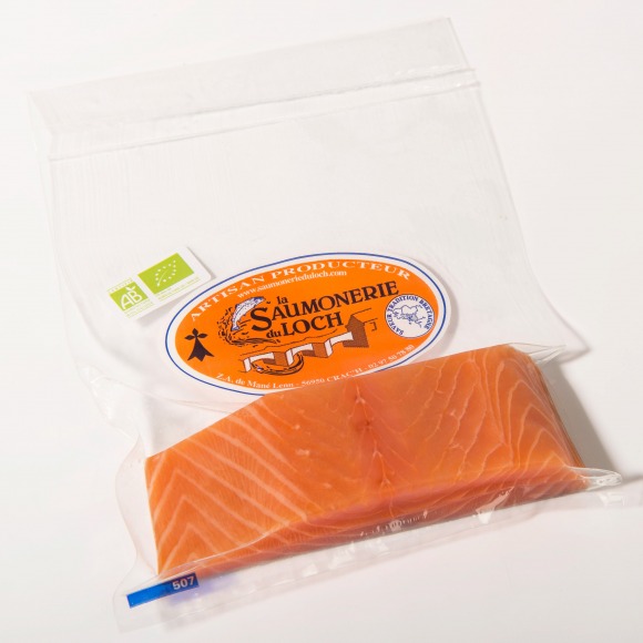 Pavé fondant de saumon fumé certifié AB avec peau sous vide. Origine saumon frais Irlande BIO. DLC: 30 jours, T: 0+4°C.